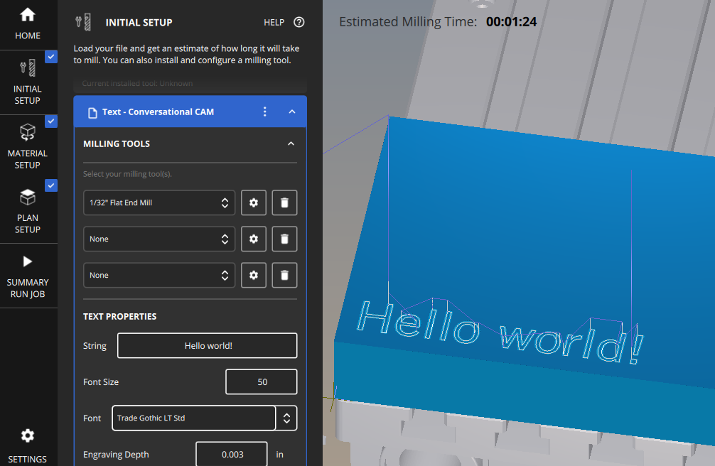 With the Conversational CAM Text feature, you can quickly generate custom text in the Bantam Tools software without having to dive back into your CAD/CAM software or vector graphics editor. To use this new feature, go to the Initial Setup tab, select New CAM, click Text, and start setting up your file.