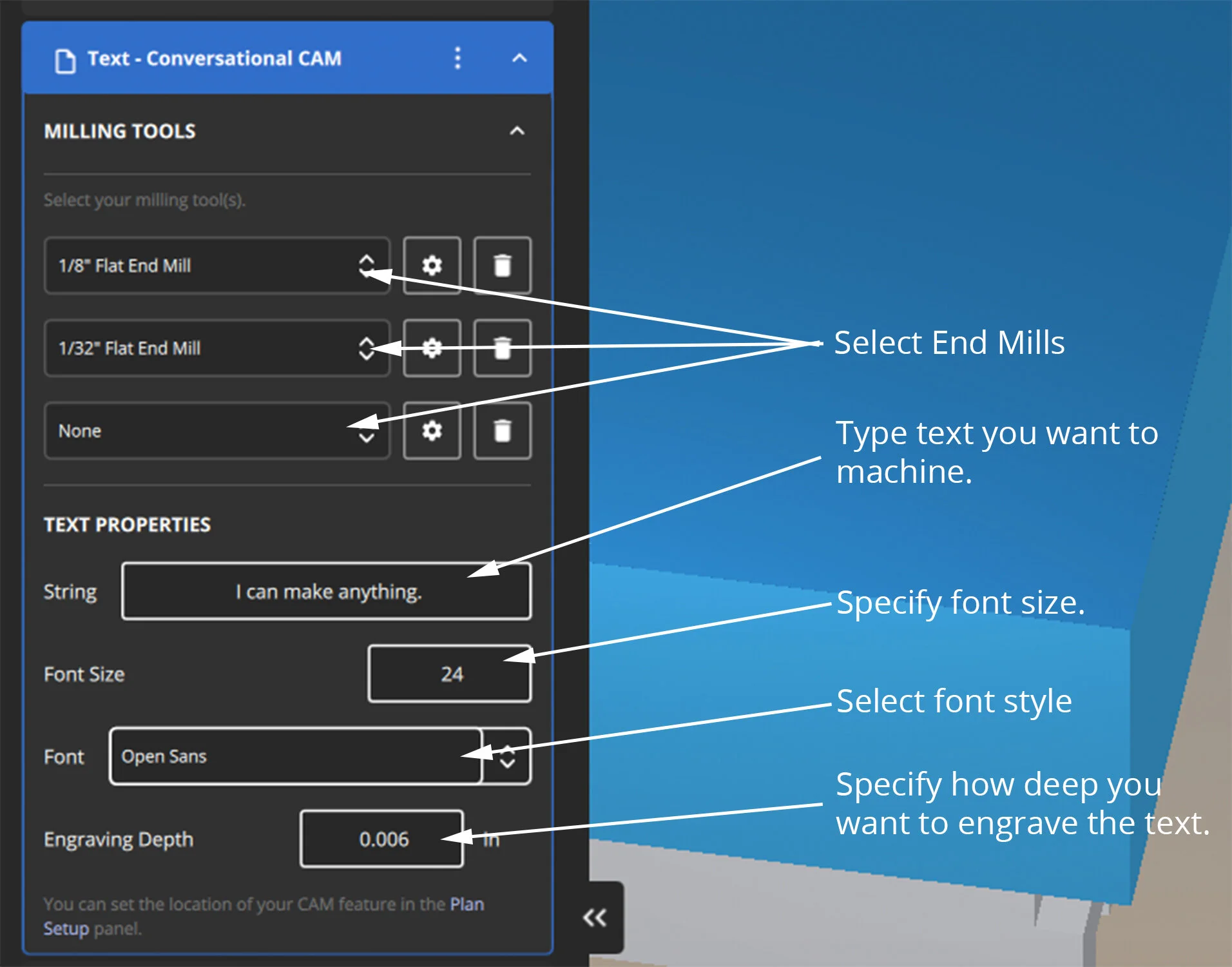 Milling Tools: Select the tooling you’ll use to engrave the text. Tooling will depend on the size of font you select.