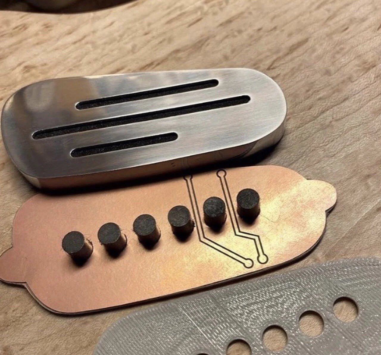 I’ve been using the Desktop PCB Milling Machine in many ways! I started out milling PCBs to act as bottom plates for my humbucker pickups, which also allowed me to create a more efficient double-coil version of my first design I had started with my 3D printer. The new method eliminates the use of internal lead in-and-out coil wire, and it saves so much more space inside the pickup. The new design also allows for the option of either two single leads or one grounded shielded lead. There are advantages to both, but it ultimately boils down to the guitarist’s preference.